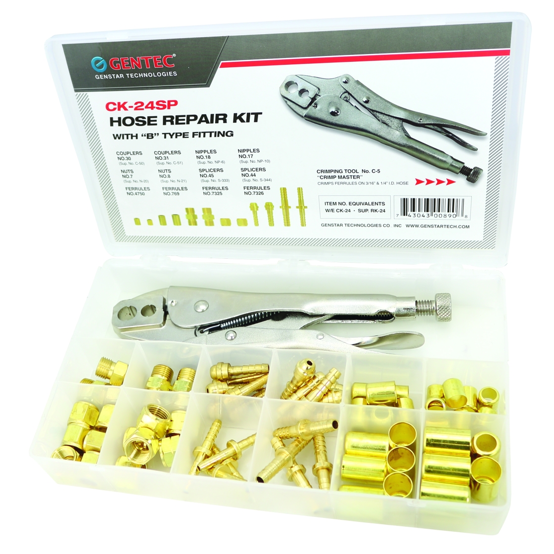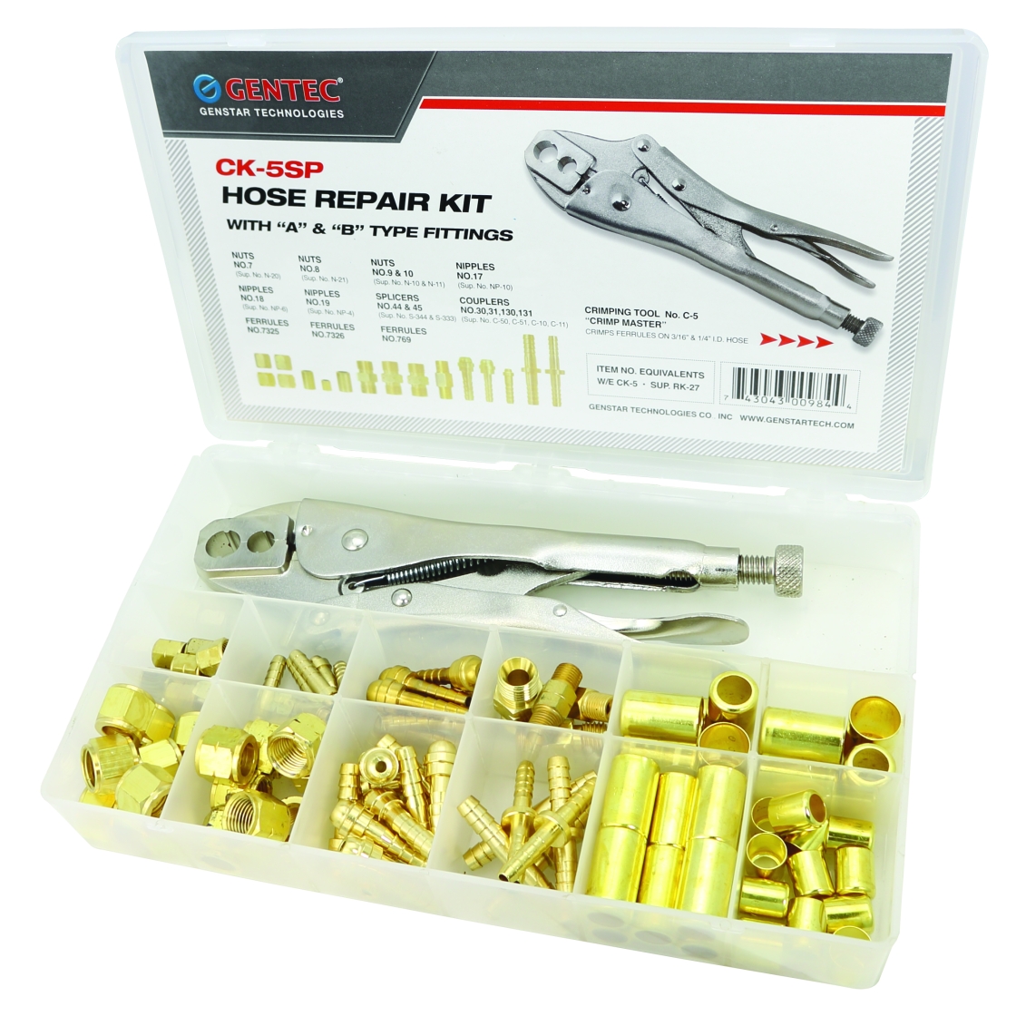 GENTEC® Hose Repair Kits are designed and outfitted to allow timely hose repair in the shop or in the field. A tough polyethylene case holds the components: Hose nuts and nipples (A & B sizes), splicers, couplers, and vari- ous size ferrules most commonly used on 3/16” and 1/4” hose. Kits are equipped with 2 types of tools (see below). A display card with the fitting numbers and the compartment location is on case lid for added convenience in selecting and reordering.
